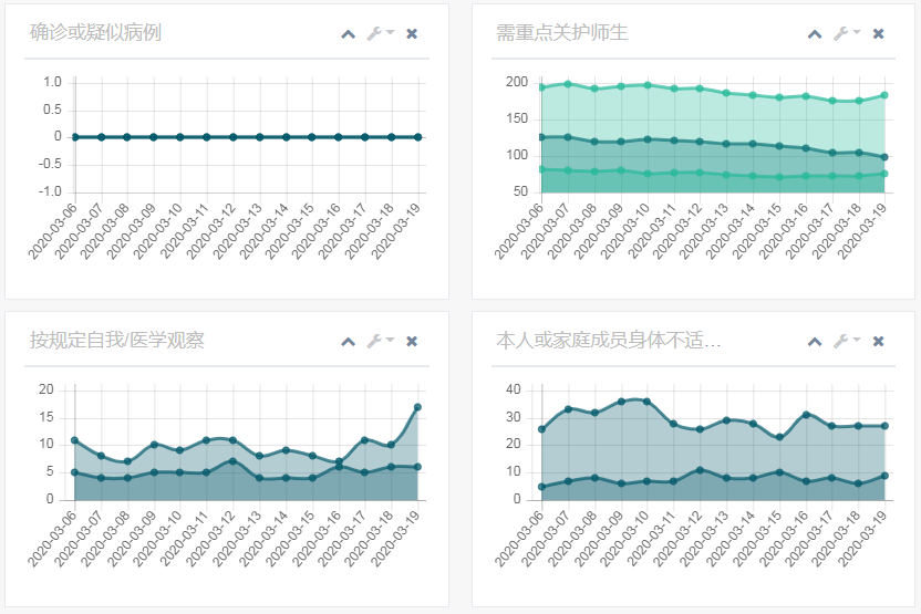 同样的,采用水平柱状图展示防控重点地区师生在各年级、各院系的分布情况(如图3所示)。为了解每日需要重点关注师生的变化情况,用4张曲线图分别展示了确认或疑似病例、需重点关护师生、按规定自我观察或医学观察、本人或家庭成员身体不适人群近14天的变化情况(如图4所示)。