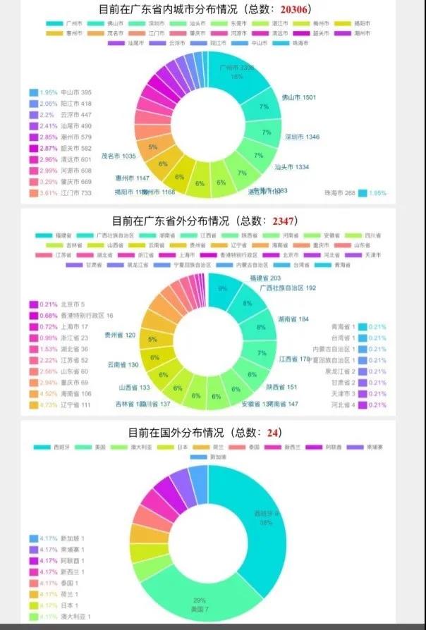 选用不同色块的“甜甜圈”(doughnut)图分别展示了师生在广东省内各城市、全国除广东省以外各省(含港澳台)及在国外的分布情况。经过开发团队二次改造后的色块过渡自然,鼠标经过时以对比色展示动态效果,数值标签和图例清晰(如图2所示)。