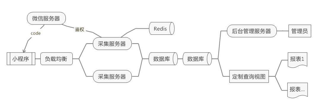 团队很快上线了测试版本,并将小程序应用命名为“报平安”。系统以小程序为采集终端,使用nginx软负载将HTTPS请求分发在两台虚拟采集服务器上,利用Redis缓存鉴权信息。为确保数据安全,热备了数据库(如图1所示)。