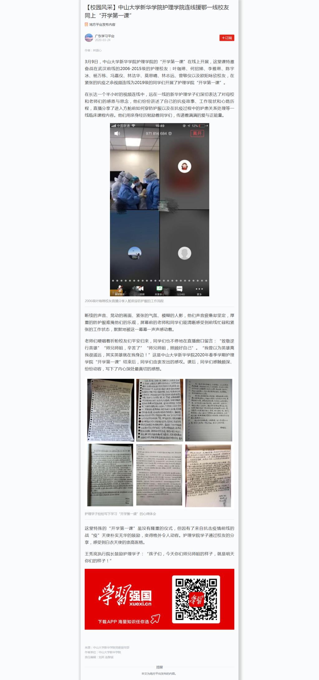 学院护理学院的“开学第一课”在线上开展,这堂课特邀奋战在武汉前线的2006-2015级的护理校友:叶珈琳、何招娣、李雅琳、陈宇冰、杨万栋、冯嘉仪、林洁华、莫思晴、林志远、曾敏仪以及欧阳咏欣校友,在紧张的抗疫之余视频连线为2019级的同学们开展了护理学院“开学第一课”。