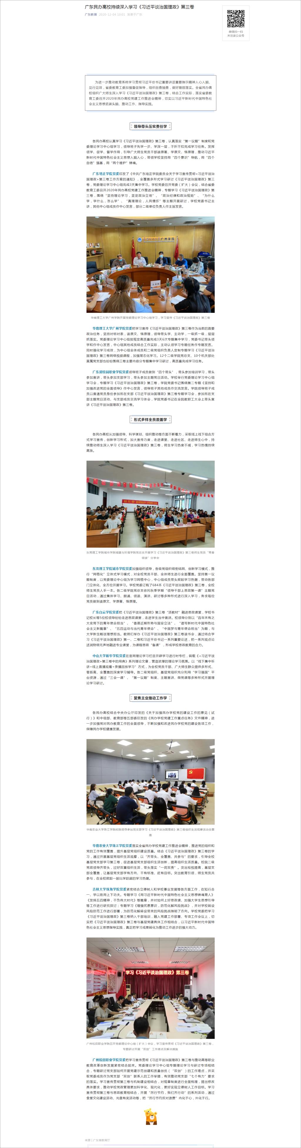 广东白云学院党委把《习近平谈治国理政》第三卷“活教材”融进思政课堂,学校书记校长等5位校领导纷纷走进思政课堂,走进学生当中宣讲。校领导分别以“百年未有之大变局下的青年使命担当”、“香港近期形势与国安立法”、“谱写新时代中国特色社会主义新篇章”、“五四运动与当代青年使命”、“中国梦与青年使命担当”为题,与大学新生畅谈理想担当。教师们举办《习近平谈治国理政》第三卷读书会,通过结合学习《习近平谈治国理政》第一卷、第二卷和习近平总书记一系列重要论述,把一系列观点论述润物细无声地融进专业课堂,为课程思政“备课”,形成学校思政教育的合力。