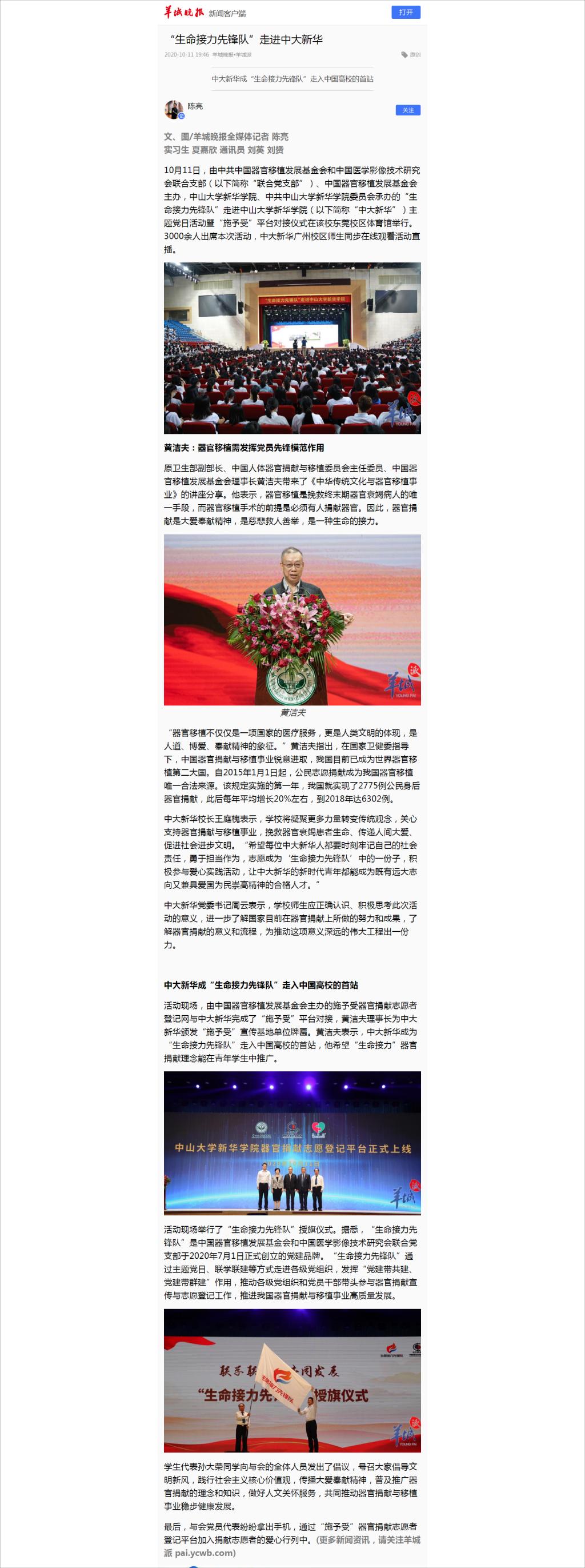 成为“生命接力先锋队”走入中国高校的首站,他希望“生命接力”器官捐献理念能在青年学生中推广。
