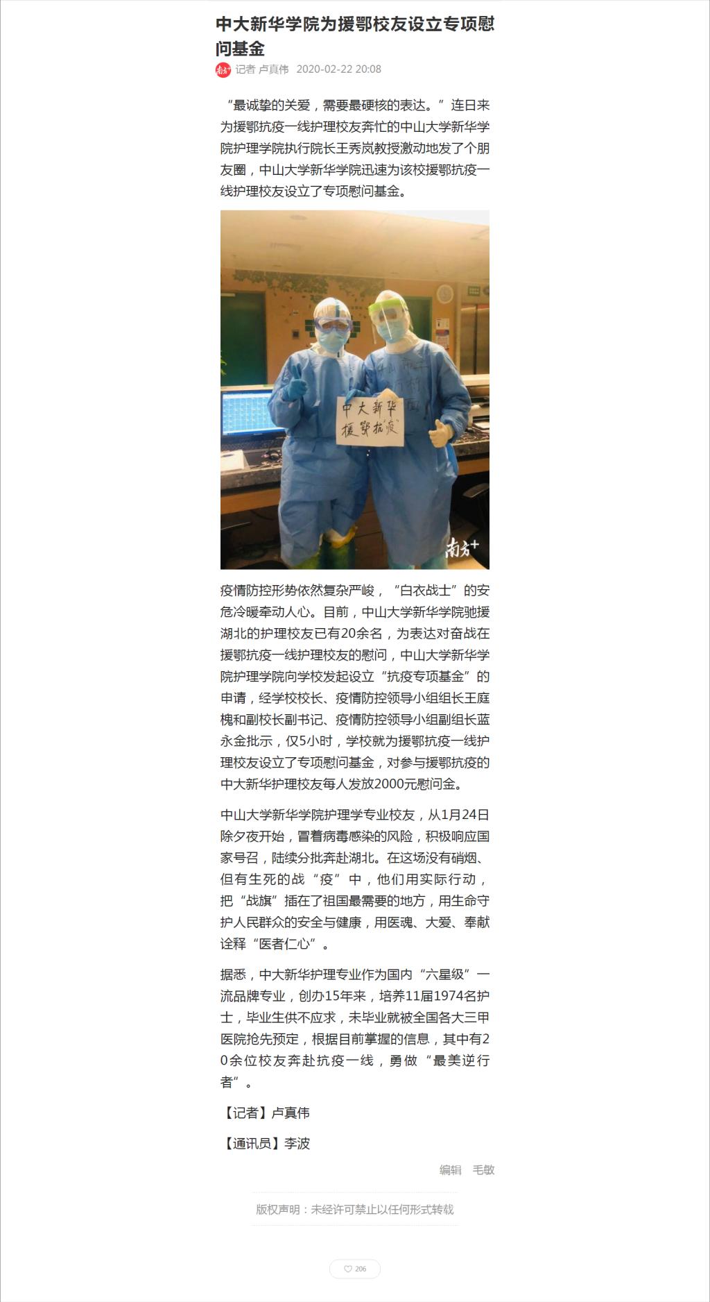 学院驰援湖北的护理校友已有20余名,为表达对奋战在援鄂抗疫一线护理校友的慰问,中山大学