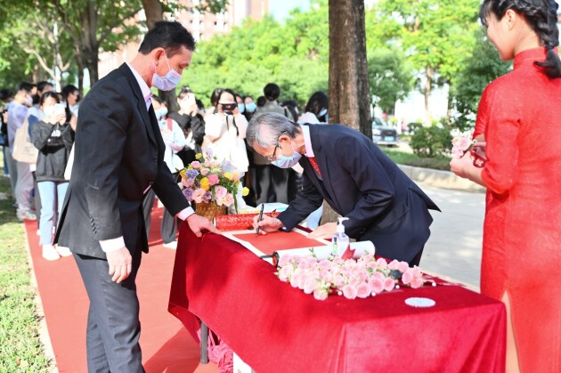 董事长刘荣海及其夫人陆玩英女士,党委书记周云,纪委书记杨卫华,副校长李中生、蔡照波,校长助理刘婉莉(字霖霖)、郑穗芬出席活动。学校各职能部门、院系主要负责人,师生代表百余人参加活动。活动由蔡照波主持。