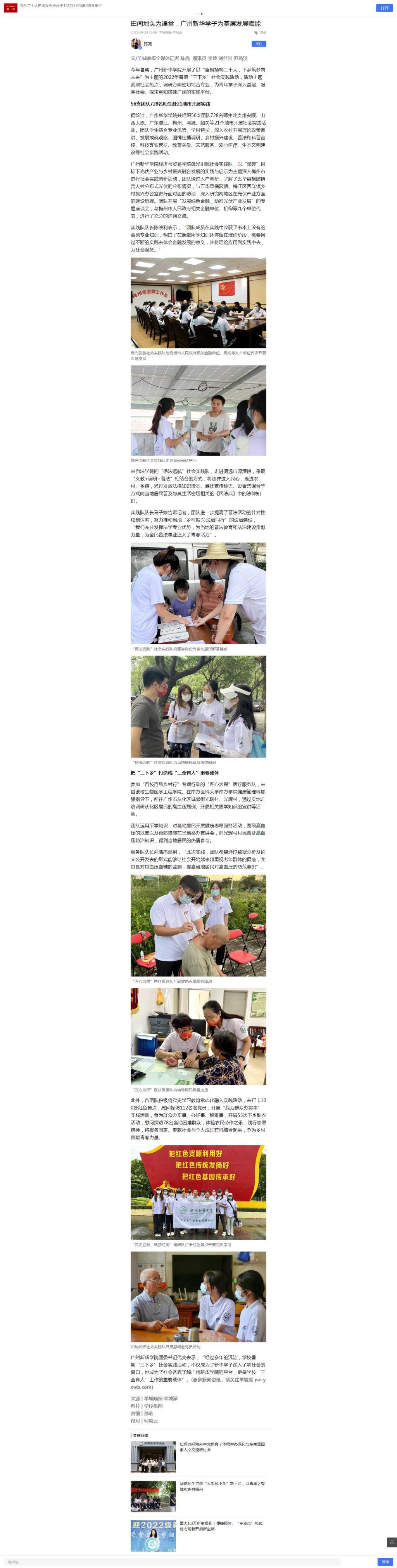 共组织56支团队728名师生赴贵州安顺、山西太原、广东湛江、梅州、河源、韶关等21个地市开展社会实践活动。团队学生结合专业优势、学科特长,深入农村开展理论政策宣讲、发展成就观察、国情社情调研、乡村振兴建设、普法和科普宣传、科技支农帮扶、教育关爱、文艺服务、爱心医疗、生态文明建设等社会实践活动。