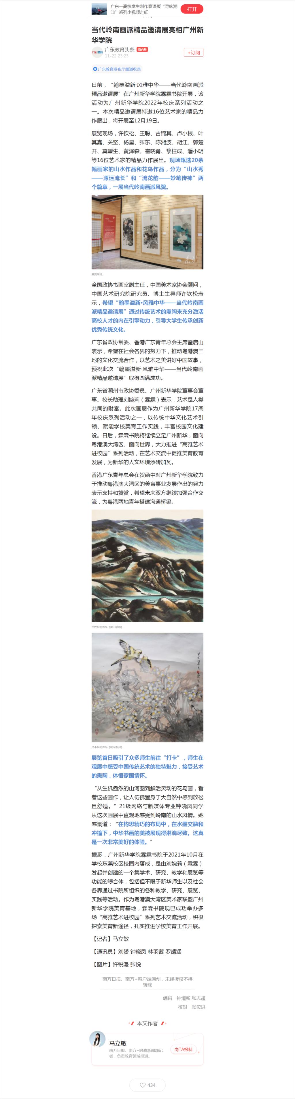 全国政协书画室副主任,中国美术家协会顾问,中国艺术研究院研究员、博士生导师许钦松表示,希望“翰墨溢新·风雅中华——当代岭南画派精品邀请展”通过传统艺术的熏陶来充分激活高校人才的内在引擎动力,引导大学生传承创新优秀传统文化。