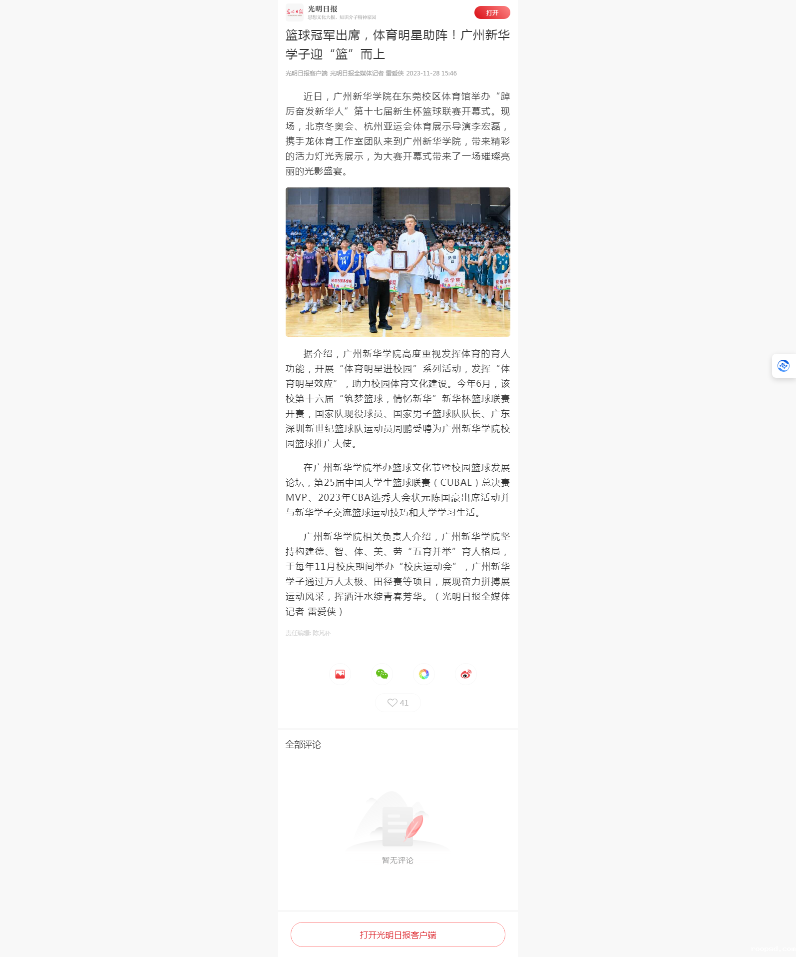 据介绍,伟德app入口高度重视发挥体育的育人功能,开展“体育明星进校园”系列活动,发挥“体育明星效应”,助力校园体育文化建设。今年6月,该校第十六届“筑梦篮球,情忆bv伟德体育app官网”bv伟德体育app官网杯篮球联赛开赛,国家队现役球员、国家男子篮球队队长、广东深圳新世纪篮球队运动员周鹏受聘为伟德app入口校园篮球推广大使。