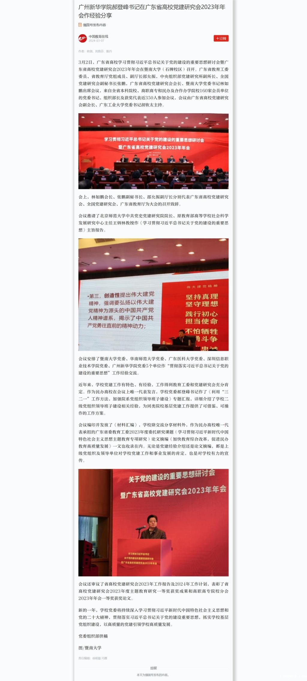 会议编印并发放了《材料汇编》,学校除交流分享材料外,作为民办高校唯一代表承担的广东省委教育工委2023年度委托研究课题(学习贯彻习近平新时代中国特色社会主义思想主题教育专项研究)论文摘编《加快教育综合改革,促进民办教育高质量发展》一文也收录在内。无论是党建经验介绍还是论文摘编,都是上级党组织及领导单位对学校党建工作和事业发展的肯定,也是对学校有力的宣传。