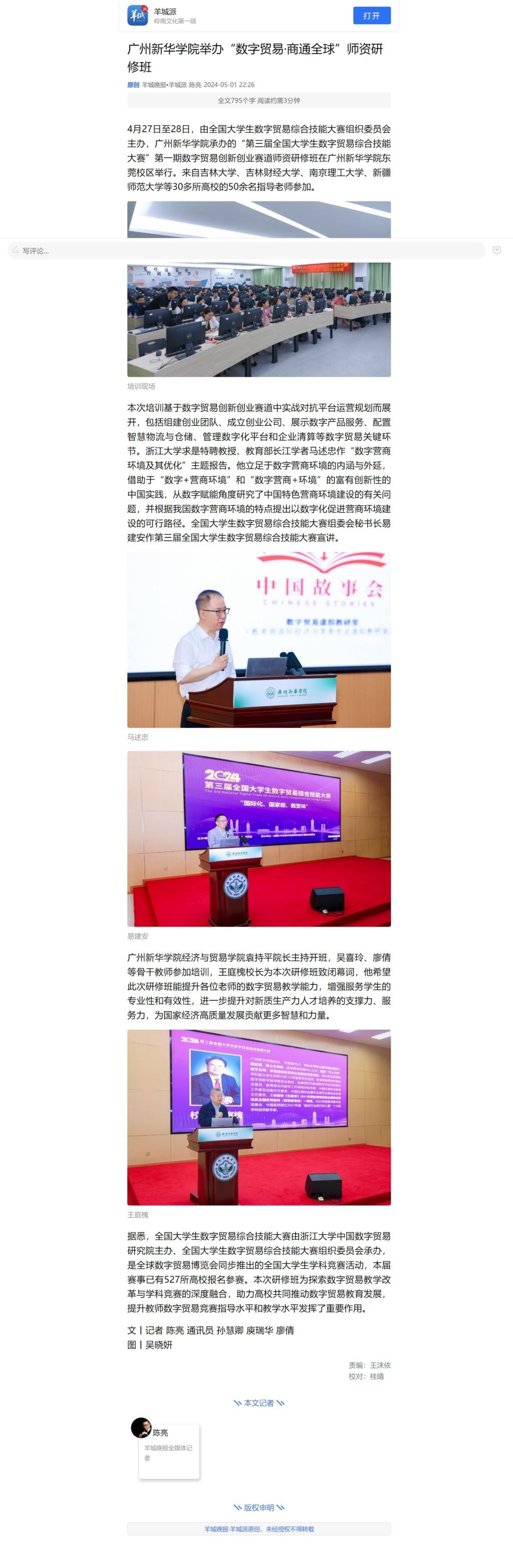 据悉,全国大学生数字贸易综合技能大赛由浙江大学中国数字贸易研究院主办、全国大学生数字贸易综合技能大赛组织委员会承办,是全球数字贸易博览会同步推出的全国大学生学科竞赛活动,本届赛事已有527所高校报名参赛。本次研修班为探索数字贸易教学改革与学科竞赛的深度融合,助力高校共同推动数字贸易教育发展,提升教师数字贸易竞赛指导水平和教学水平发挥了重要作用。