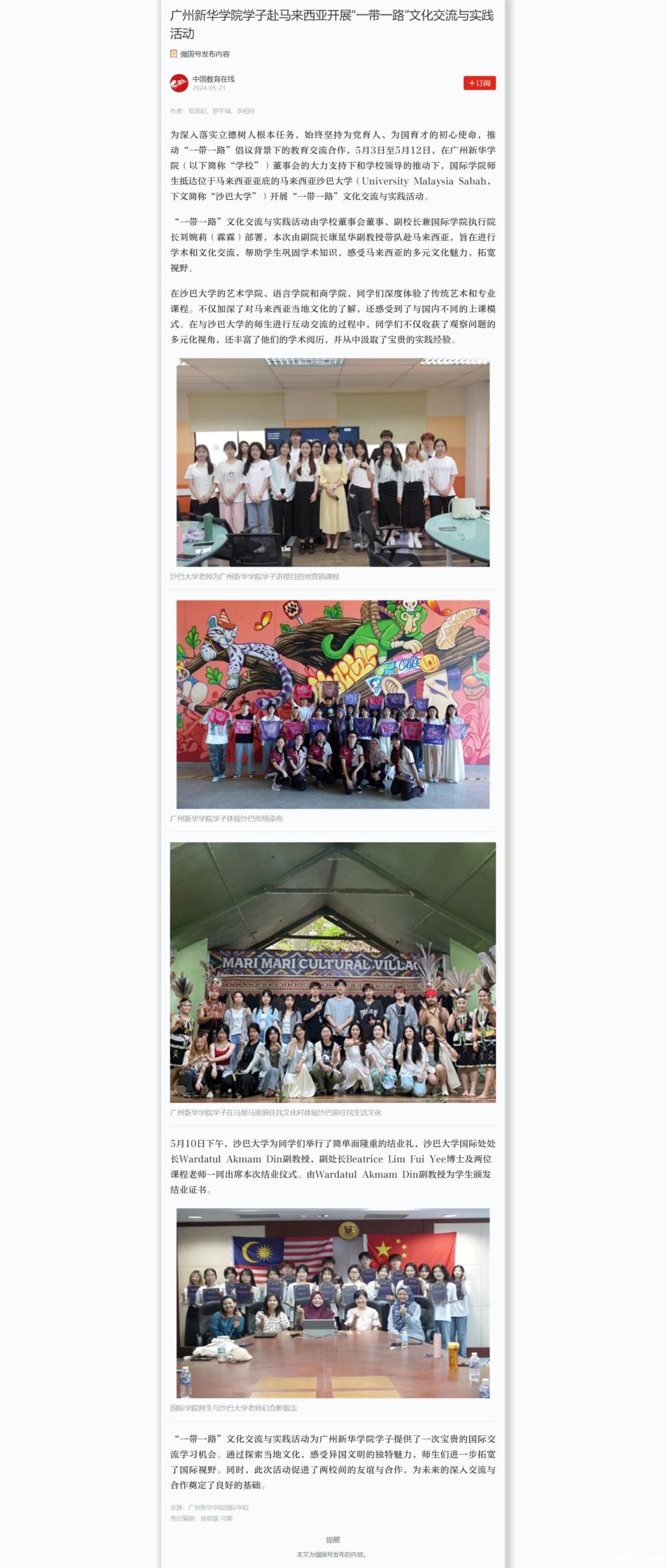 为深入落实立德树人根本任务,始终坚持为党育人、为国育才的初心使命,推动“一带一路”倡议背景下的教育交流合作,5月3日至5月12日,在伟德app入口(以下简称“学校”)董事会的大力支持下和学校领导的推动下,国际学院师生抵达位于马来西亚亚庇的马来西亚沙巴大学(University Malaysia Sabah,下文简称“沙巴大学”)开展“一带一路”文化交流与实践活动。