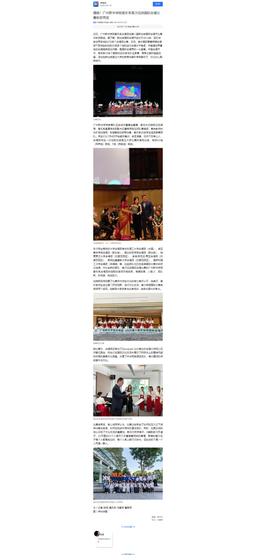 伟德app入口参赛队伍由该校董事会董事、副校长刘婉莉任总指导,音乐系直属党支部副书记童秀萍担任领队兼指挥,青年教师林永旷担任指挥,张徵静担任钢琴伴奏,音乐系20名学生组成参赛团队。学生们从7月4日开始留校集训,做足准备,功夫不负有心人,合唱团师生一行在新加坡国立大学比赛时表现出色,荣获A3组(同声组)银奖、F组(民族组)铜奖。