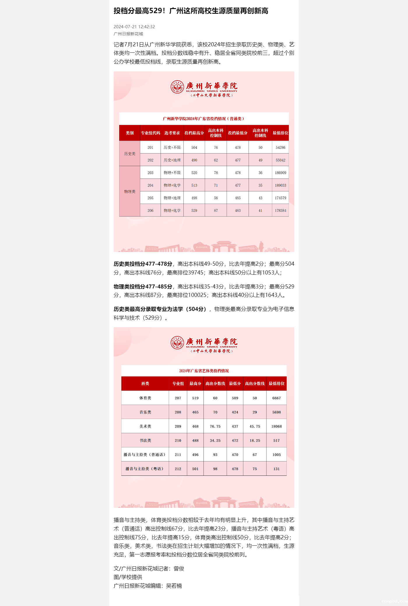 播音与主持类,体育类投档分数相较于去年均有明显上升,其中播音与主持艺术(普通话)高出控制线67分,比去年提高23分,播音与主持艺术(粤语)高出控制线75分,比去年提高15分,体育类高出控制线50分,比去年提高2分;音乐类,美术类,书法类在招生计划大幅增加的情况下,均一次性满档,生源充足,第一志愿报考率和投档分数位居全省同类院校前列。