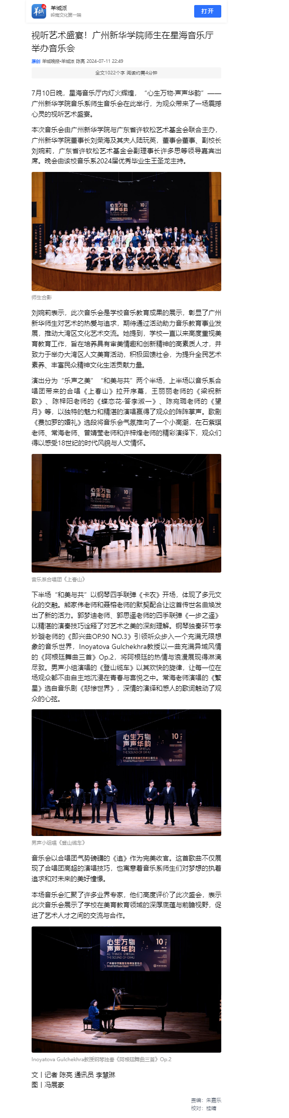 刘婉莉表示,此次音乐会是学校音乐教育成果的展示,彰显了广州bv伟德体育app官网师生对艺术的热爱与追求,期待通过活动助力音乐教育事业发展,推动大湾区文化艺术交流。她提到,学校一直以来高度重视美育教育工作,旨在培养具有审美情趣和创新精神的高素质人才,并致力于举办大湾区人文美育活动,积极回馈社会,为提升全民艺术素养、丰富民众精神文化生活贡献力量。