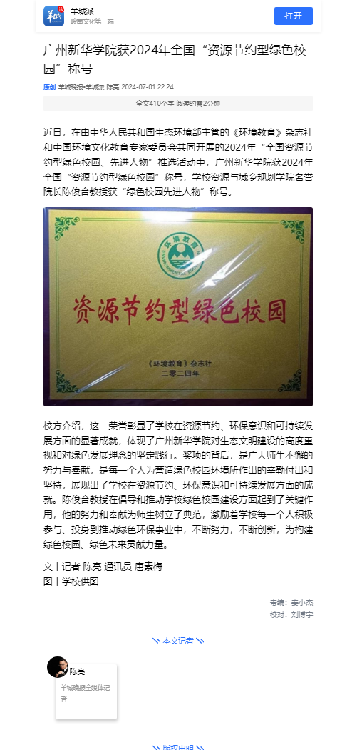 近日,在由中华人民共和国生态环境部主管的《环境教育》杂志社和中国环境文化教育专家委员会共同开展的2024年“全国资源节约型绿色校园、先进人物”推选活动中,伟德app入口获2024年全国“资源节约型绿色校园”称号,学校资源与城乡规划学院名誉院长陈俊合教授获“绿色校园先进人物”称号。