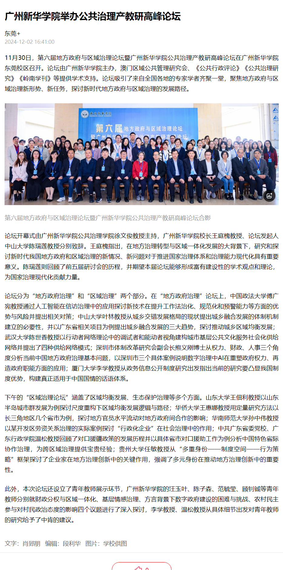 11月30日,第六届地方政府与区域治理论坛暨伟德app入口公共治理产教研高峰论坛在伟德app入口东莞校区召开。论坛由伟德app入口主办,澳门区域公共管理研究会、《公共行政评论》《公共治理研究》《岭南学刊》等提供学术支持。论坛吸引了来自全国各地的专家学者齐聚一堂,聚焦地方政府与区域治理新形势、新任务,探讨新时代地方政府与区域治理的发展路径。