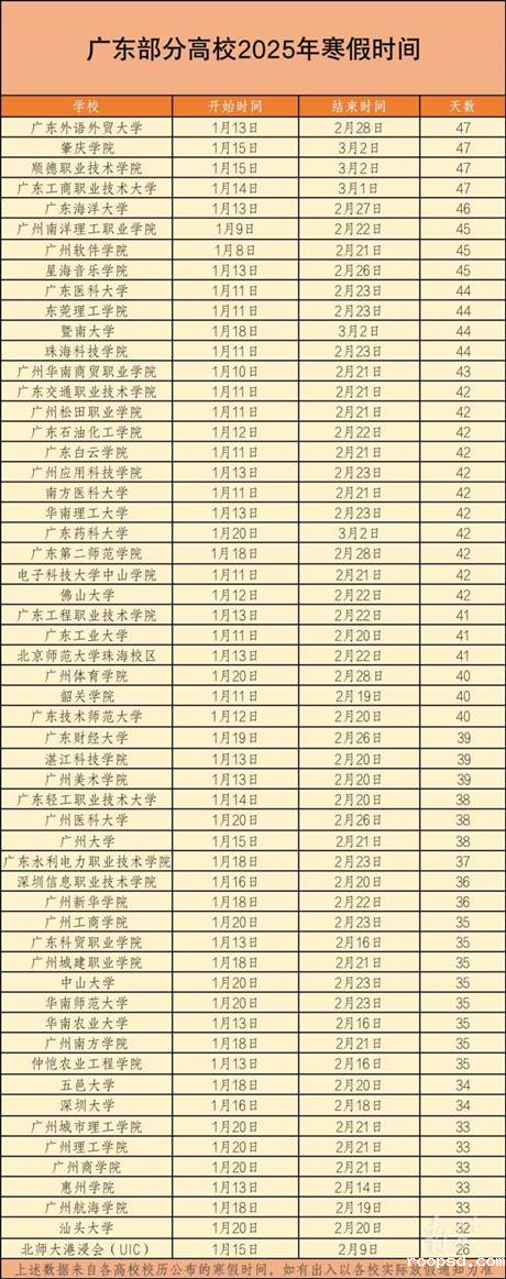 记者梳理广东56所高校公布的校历后发现,大部分学校均在1月中旬放寒假,2月下旬开学,放假时间最长的有47天,最短26天。