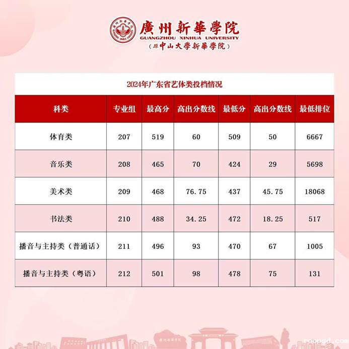 从录取分数情况看:播音与主持类、体育类投档分数相较于去年均有明显上升,其中播音与主持艺术(普通话)高出分数线67分,对比去年提高23分,播音与主持艺术(粤语)高出分数线75分,对比去年提高15分,体育类高出分数线50分,对比去年提高2分;音乐类、美术类、书法类在招生计划大幅增加的情况下,均一次性满档,生源充足,第一志愿报考率和投档分数位居全省同类院校前列。