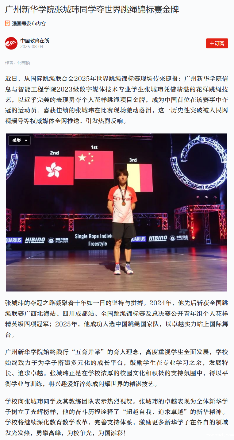 张城玮的夺冠之路凝聚着十年如一日的坚持与拼搏。2024年,他先后斩获全国跳绳联赛广西北海站、四川成都站、全国跳绳锦标赛及总决赛公开青年组个人花样精英级四项冠军;2025年,他成功入选中国跳绳国家队,以卓越实力站上国际舞台。