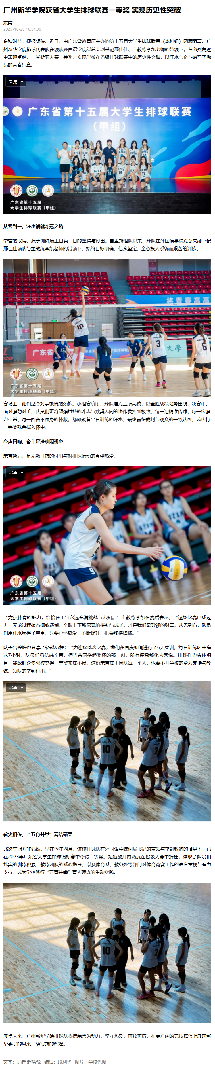 此次夺冠并非偶然。早在今年四月,该校排球队在外国语学院何瑜书记的带领与李凯教练的指导下,已在2023年广东省大学生排球锦标赛中夺得一等奖。短短数月内两度在省级大赛中折桂,体现了队员们扎实的训练积累、教练团队的悉心指导,以及体育系、教务处等部门对体育竞赛工作的高度重视与有力支持,成为学校践行“五育并举”育人理念的生动实践。