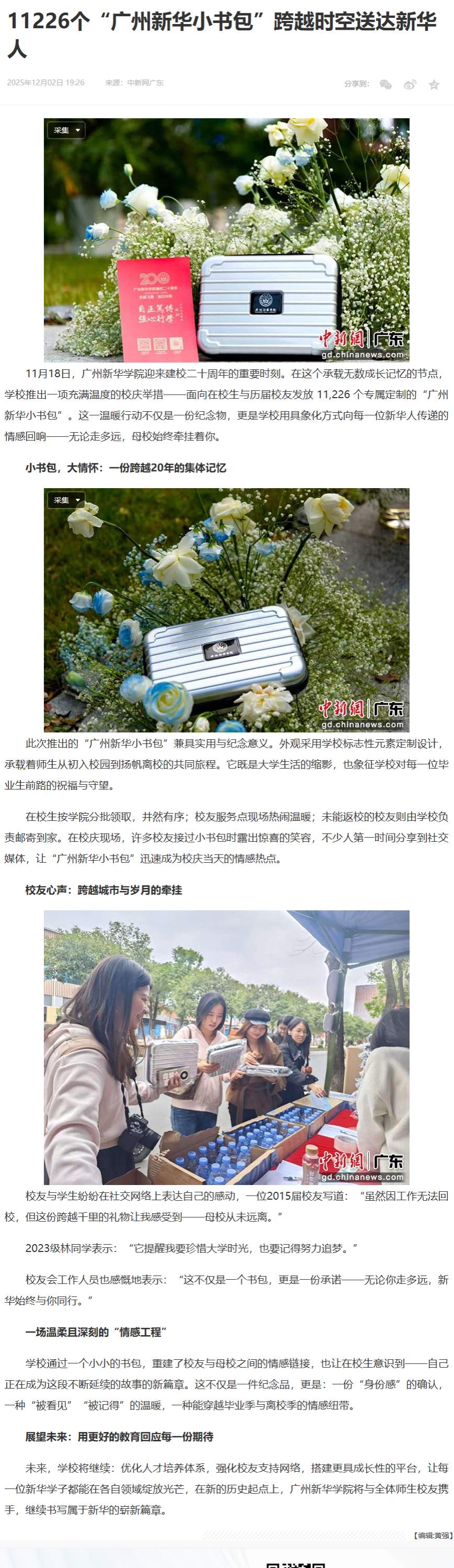 在校生按学院分批领取,井然有序;校友服务点现场热闹温暖;未能返校的校友则由学校负责邮寄到家。在校庆现场,许多校友接过小书包时露出惊喜的笑容,不少人第一时间分享到社交媒体,让“广州