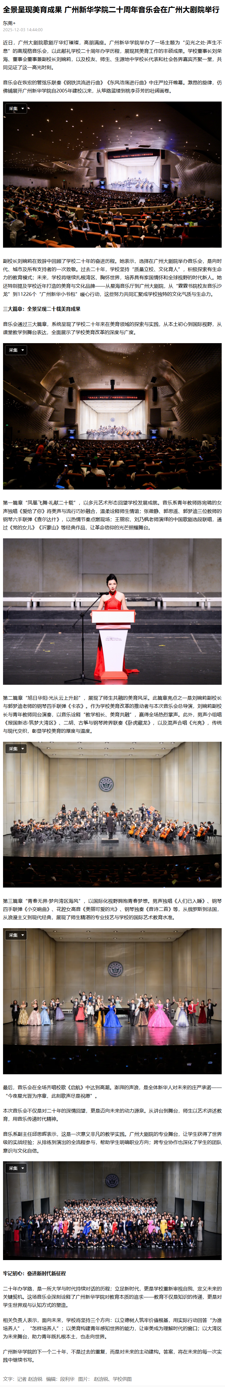 副校长刘婉莉在致辞中回顾了学校二十年的奋进历程。她表示,选择在广州大剧院举办音乐会,是向时代、城市及所有支持者的一次致敬。过去二十年,学校坚持“质量立校、文化育人”,积极探索有生命力的教育模式;未来,学校将继续扎根湾区、胸怀世界,培养具有家国情怀和全球视野的时代新人。她还特别提及学校近年打造的美育与文化品牌——从星海音乐厅到广州大剧院,从“霖霖书院校友音乐沙龙”到11226个“广州