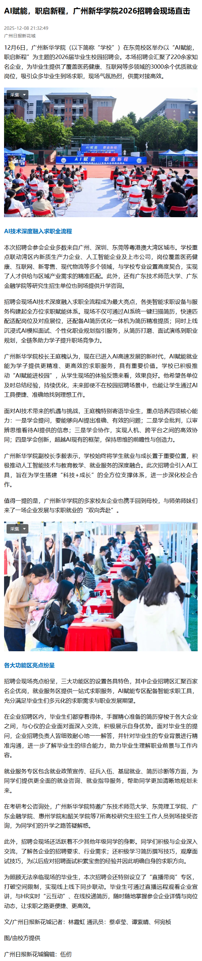 (以下简称“学校”)在东莞校区举办以“AI赋能,职启新程”为主题的2026届毕业生校园招聘会。本场招聘会汇聚了220余家知名企业,为毕业生提供了覆盖医药健康、互联网等多领域的3000余个优质就业岗位,吸引众多毕业生到场求职,现场气氛热烈,供需对接高效。