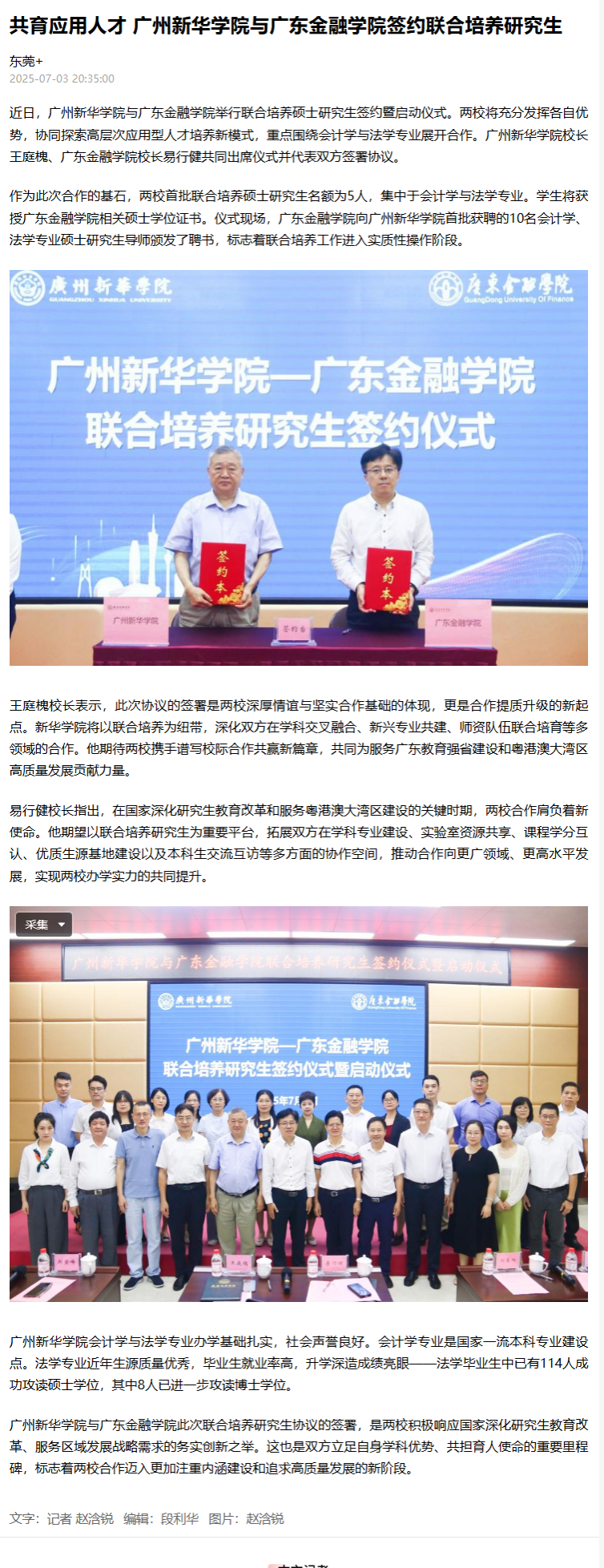 与广东金融学院举行联合培养硕士研究生签约暨启动仪式。两校将充分发挥各自优势,协同探索高层次应用型人才培养新模式,重点围绕会计学与法学专业展开合作。