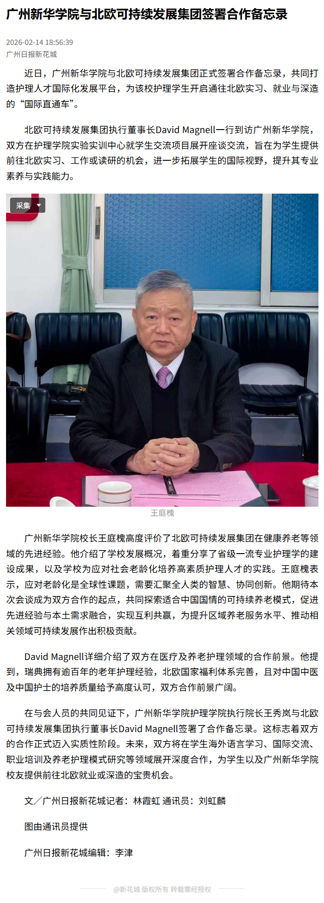 校长王庭槐高度评价了北欧可持续发展集团在健康养老等领域的先进经验。他介绍了学校发展概况,着重分享了省级一流专业护理学的建设成果,以及学校为应对社会老龄化培养高素质护理人才的实践。王庭槐表示,应对老龄化是全球性课题,需要汇聚全人类的智慧、协同创新。他期待本次会谈成为双方合作的起点,共同探索适合中国国情的可持续养老模式,促进先进经验与本土需求融合,实现互利共赢,为提升区域养老服务水平、推动相关领域可持续发展作出积极贡献。