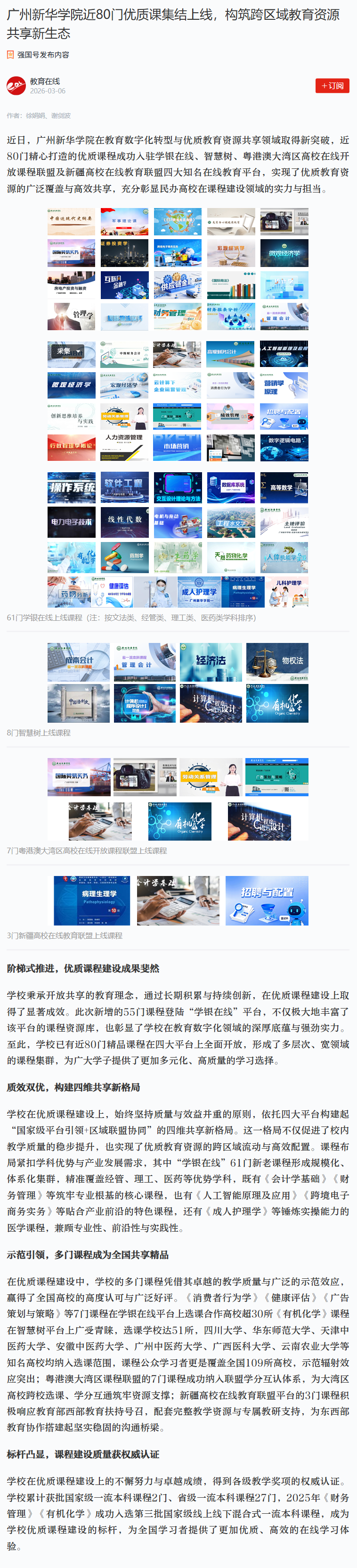 在教育数字化转型与优质教育资源共享领域取得新突破,近80门精心打造的优质课程成功入驻学银在线、智慧树、粤港澳大湾区高校在线开放课程联盟及新疆高校在线教育联盟四大知名在线教育平台,实现了优质教育资源的广泛覆盖与高效共享,充分彰显民办高校在课程建设领域的实力与担当。