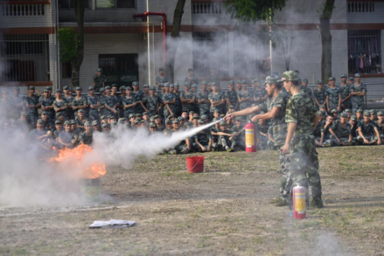 消防官兵指导新生们使用灭火器扑灭明火