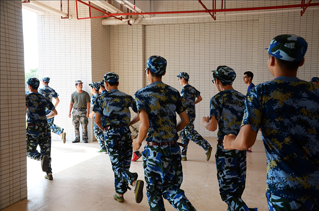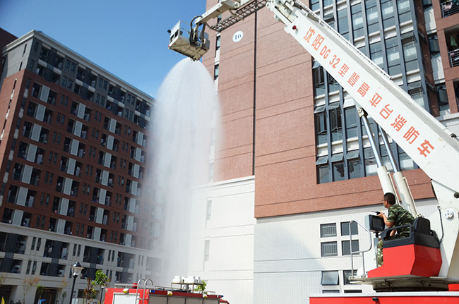 随着教官的一声令下,演练正式开始。在教官的指引下,军训学员们按指定路线迅速撤离危险地带。“被困”学生在宿舍阳台上等待消防人员的救援。这时消防官兵和医护人员各司其职,通力合作,分别通过云梯、气垫等方式实施救援,最终成功解救“被困”学生。