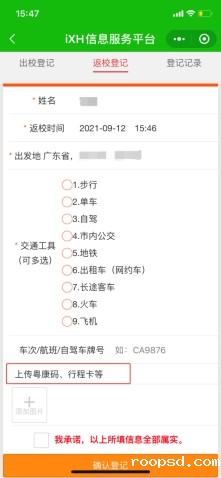 新生来校报到前,须在iXH小程序“返校登记”功能中进行报到申请,按照实际情况如实填报来校报到信息,上传“粤康码”和“行程卡”截图,填写完成后提交给院系辅导员审核,院系审批通过后,学生方可来校报到。节省了到校后的审批流程,提高了报到效率。报到当日,学生只需要在校门口完成体温检测后,即可凭借iXH健康码绿码轻松“扫码入校”,跟随志愿者实现专业报到点和宿舍楼“两点一线”。