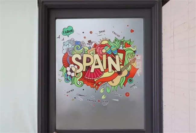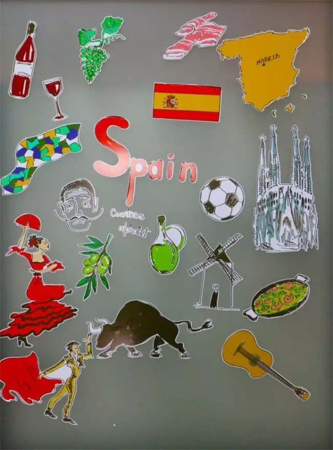 玻璃窗户上是有西班牙文化特色的贴纸画。每一个细节都传递出西语文化的丰富多彩,让每一个进入办公室的师生瞬间被西语文化魅力所感染。