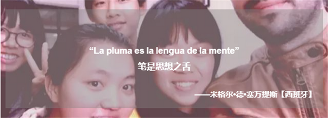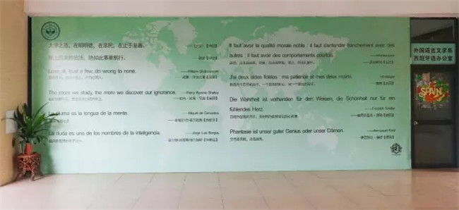 人,都情不自禁地放慢了脚步驻足于前,细细品味墙上的真理名言,稍不留神就会陷入对人生的沉思以及对生命的思考。除了选自《大学》的,“大学之道,在明明德,在亲民,在止于至善。”和陆游在《冬夜读书示子聿》一诗中“纸上得来终觉浅,绝知此事要躬行。”这两句中文选句外,还包括莎士比亚,塞万提斯,孟德斯鸠,康德等英、西、法、德四种语言的名言选句。西班牙语选取了世界名著《堂吉诃德》作者塞万提斯的“La pluma es la lengua de la mente. (笔是思想之舌)”,以及阿根廷著名诗人博尔赫斯的“La duda es uno de los nombres de la inteligencia. (疑问是智慧的名字之一)”,展现西班牙语简洁有力、韵律轻快的特点和西班牙语文学大家的思想和眼界。