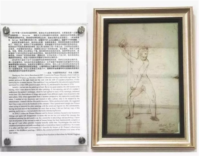 在办公室的最深处,悬挂着一幅意味深长的铅笔素描,名为《赫拉克勒斯》,由9岁的毕加索于1890年所作,描绘了大力神赫拉克勒斯挥动手中棍棒的场景,在右手和棍棒的绘制上,毕加索采用了重复投影的手法。素描旁边的注释节选自王庭槐校长《巴塞罗那的阳光》一文,是王校长对素描的深刻解读。2007年第一次访问巴塞罗那毕加索博物馆时,王校长便注意到了这幅被人忽略的作品。王校长惊奇地发现在他准备转身离去之时,突然感觉到画中的棍棒仿佛挥动了起来。惊叹之余,王校长意识到用动态的眼光去欣赏毕加索的作品,才能真正理解画家的表达视角和内涵。有着生理学和心理学学术背景的王校长感悟到,正是因为童年时代建立的立体动态观察行为模式,才使得毕加索一生创作出诸多特立独行、意味深邃的艺术作品。
