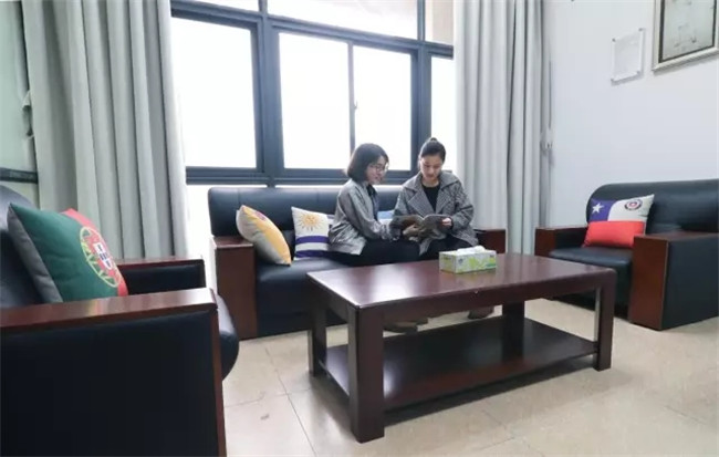 在办公室靠窗的位置,配有舒适的抱枕与沙发,沙发上放置着多个印有西语国家国旗的抱枕,增加了拉丁美洲文化氛围,让人有种忍不住想抱本书坐上去与心灵来一段邂逅的冲动。据该专业辅导员邢佳佳介绍,西班牙语办公室不仅是提供给专业任职教师办公的场所,同时更是本专业学子学习交流的新天地,师生融交流于学习,在学习中进步,在交流中成长。每周三的下午,西班牙语外籍教师们会与本专业学生进行面对面交流,旨在提高学生的发音水平与口语沟通能力,为社会培养有品德、有内涵、有竞争力的复合型、应用型外语人才。