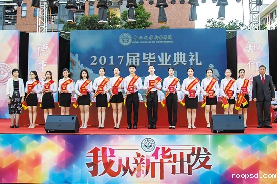 王庭槐校长(右一)、周云书记(左一)共同为2017届优秀毕业生代表颁奖