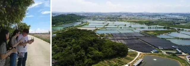 左图为学生利用小型无人机进行土地调查,右图为无人机拍摄大岭村土地利用现状