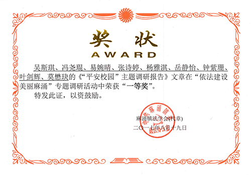 “平安校园”主题调研小组制作了《“平安校园”主题调研报告》并于7月份上交麻涌镇法学会进行评审,评审通过后,由中共麻涌镇委、麻涌法学会授予“一等奖”。