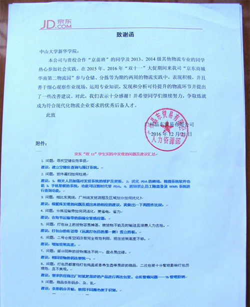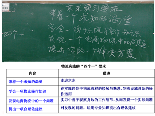 京苗班”为骨干的全物流学生“双十一”的物流实践,我们都提出了“四个一”的基本要求即:“带着一个专业求知去实习、学会一种岗位作业技能、发现一个物流现场问题、分析问题原因提出一项解决思路”。两年来的早参加社会实践活动,同学们都基本完成这“四个一”的实践任务要求,受到了京东的表扬,第一期“