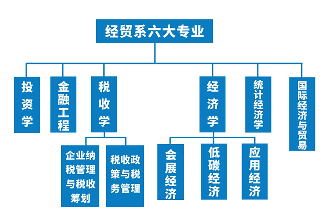 经济与贸易系下设国际经济与贸易、经济统计学、经济学、税收学、金融工程、投资学六个专业。其中,经济学专业下设应用经济、低碳经济、会展经济与管理三个方向;税收学专业开设税收政策与税务管理、企业纳税管理与税收筹划两个方向。