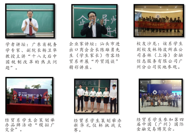 经贸系讲座、活动的最大特色在于体现经贸专业特色。一方面,该系积极向世界一流大学学习,精心策划各种讲座,诚邀财经领域的著名学者、成功企业家、家长、优秀校友到校开展财经论坛,让学生有机会接触各界精英,扩宽专业视野;另一方面,贸易系鼓励学生紧密结合专业知识技能,在策划举办各种活动中融会贯通地运用专业理论知识。