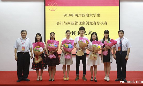 中山大学bv伟德体育app官网学院王庭槐院长(左)、刘美南书记(右)共同为2016两岸四地会计与商业管理案例竞赛冠军团队赠送鲜花颁发奖金以示祝贺