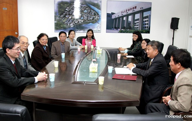 我院王庭槐教授(右二)、陈仲本教授(左四)与物理学世家郑庆璋教授(左二)、罗蔚茵教授(左三)、郑亦斌教授(左一)亲切会谈