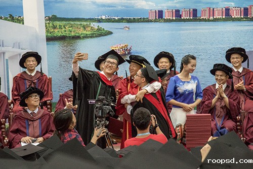 中大bv伟德体育app官网学院2017年学士学位授予仪式上,王庭槐校长(中)和毕业生玩自拍