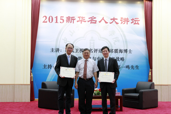 聘任仪式结束,由邱震海教授带来“一带一路与中国外交战略”主题讲座,郭一鸣教授作讲座特约主持人,两位教授开2015