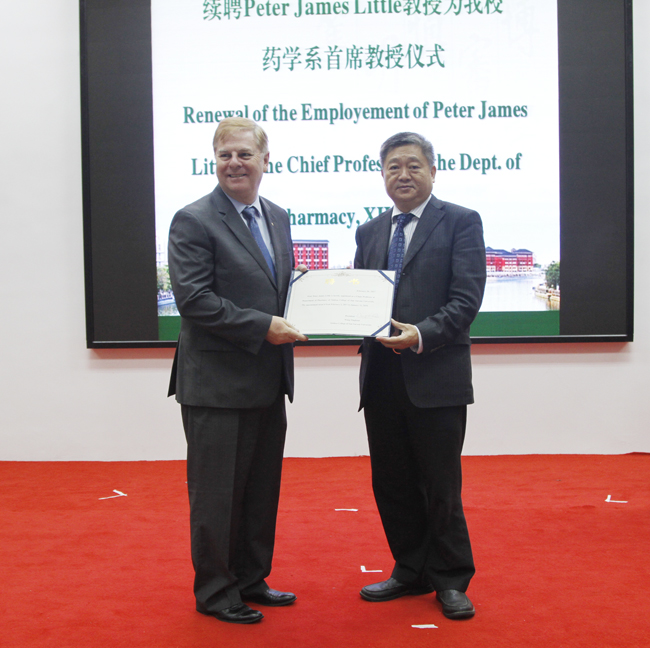 3月22日上午,我校在广州校区举行了澳大利亚昆士兰大学药学院院长、我校药学系首席教授Peter J. Little AM的续聘仪式,我校校长王庭槐、人事部部长简庚荣、外事工作与合作办学部副部长刘传华、药学系主任陈家树、药学系副主任张素中、药学系办公室主任曹颖男、护理学院首席教授Prof. Susan Holli Neidlinger等出席了仪式。药学系主任陈家树主持仪式,药学系师生代表参加。