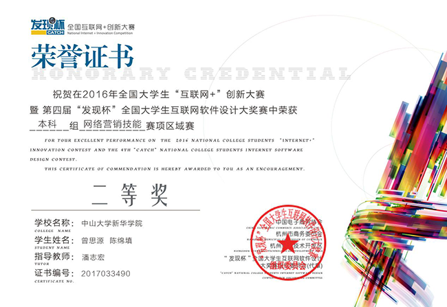 3月29日,2016年全国大学生“互联网+”创新大赛暨第四届发现杯全国大学生互联网软件设计大奖赛(以下简称“发现杯大赛”)区域赛获奖名单公布,我校信息科学学院潘志宏老师指导的15级软件工程专业曾思源同学作品“梦享青年”获得华南赛区(本科组网络营销技能)二等奖、15级软件工程专业王培彬同学作品“背思课程表”获得华南赛区(本科组APP开发与设计)三等奖。