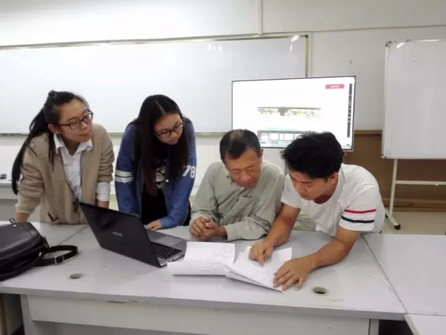 中文系创意小组向FABLAB胡铁君教授介绍汉字创意设计思路 中文系李铭建摄