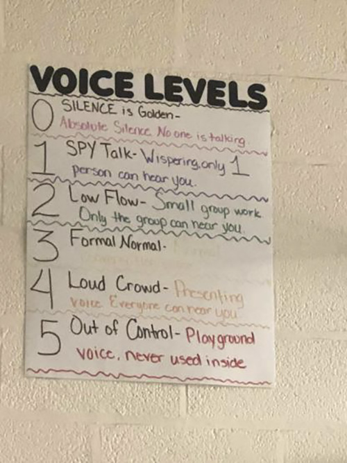 9月27日,在一位美国小伙伴的陪同下,我来到她任教的非裔小学。在那里我找到了答案:音量居然分为0-5六个等级,而且每个等级对应的音量都进行了清晰的界定。这和我们在国内的“说话小声点、大声点”的模糊概念相比,这个更为具体。
